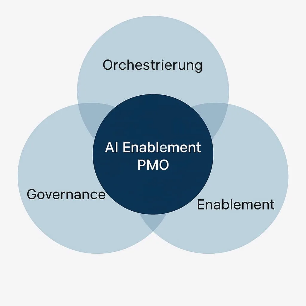 Ein AI Enablement PMO bildet das zentrale Nervensystem für die strukturierte Einführung und Skalierung von KI im Unternehmen. Es vereint drei wesentliche Dimensionen, die in ihrer Gesamtheit den Erfolg der KI-Transformation sicherstellen: