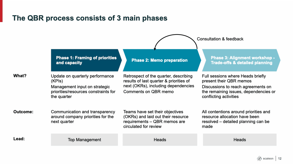 The individual parties involved in the execution of the corporate strategy must be consulted. This helps to identify potential challenges and opportunities. Through the regular review and adjustment of goals within the QBR framework, companies can ensure that their strategy remains current and relevant at all times.