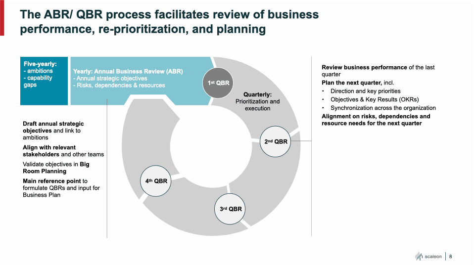 A QBR process installed at company level enables a more agile adaptation of the corporate strategy to changing conditions. This is essential for remaining competitive in dynamic markets. Through the regular review and adjustment of goals within the QBR framework, companies can ensure that their strategy remains current and relevant at all times.