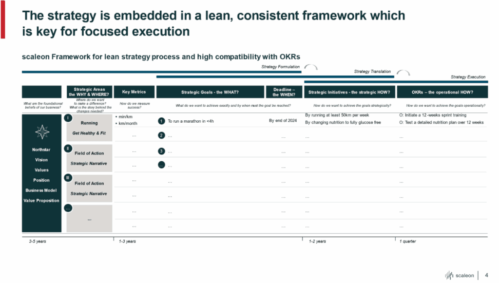 Strategic clarity ensures that the direction and goals of a company are documented in a way that is unambiguous and comprehensible to all those involved. It creates a shared point of reference that ensures all employees can work in a targeted and coordinated manner toward the execution of the strategy.